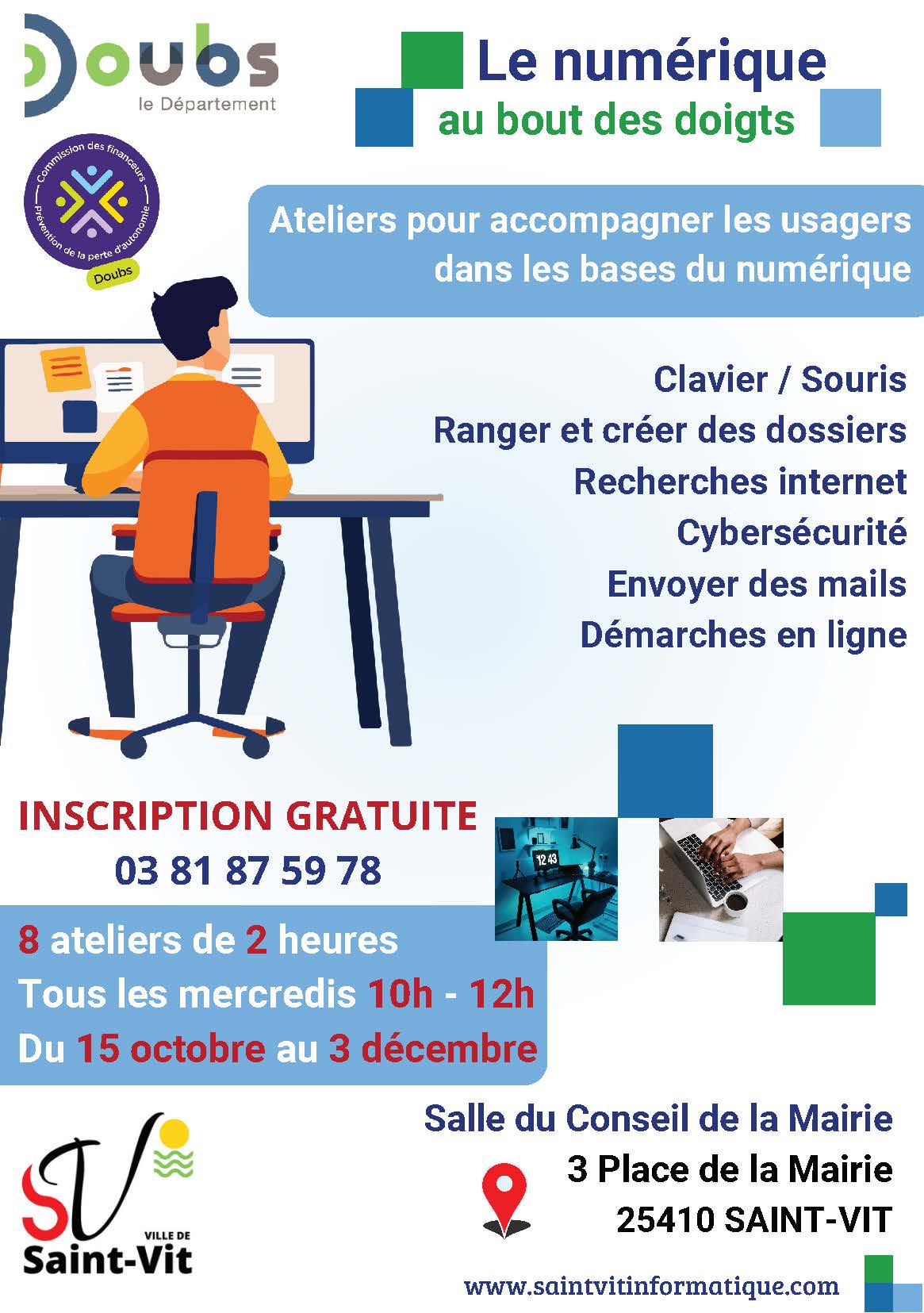 Vous voulez vous familiariser avec l’informatique et les démarches en ligne ? Ces ateliers, proposés par Saint-Vit informatique, en lien avec la mairie de Saint-Vit, vous guident dans les bases du numérique.