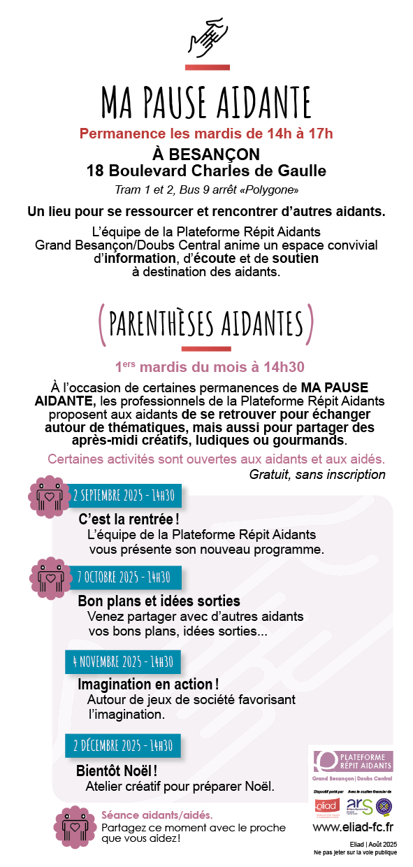 Retrouvez le programme et toutes les informations de la Plateforme Répit Aidants sur : www.eliad-fc.fr